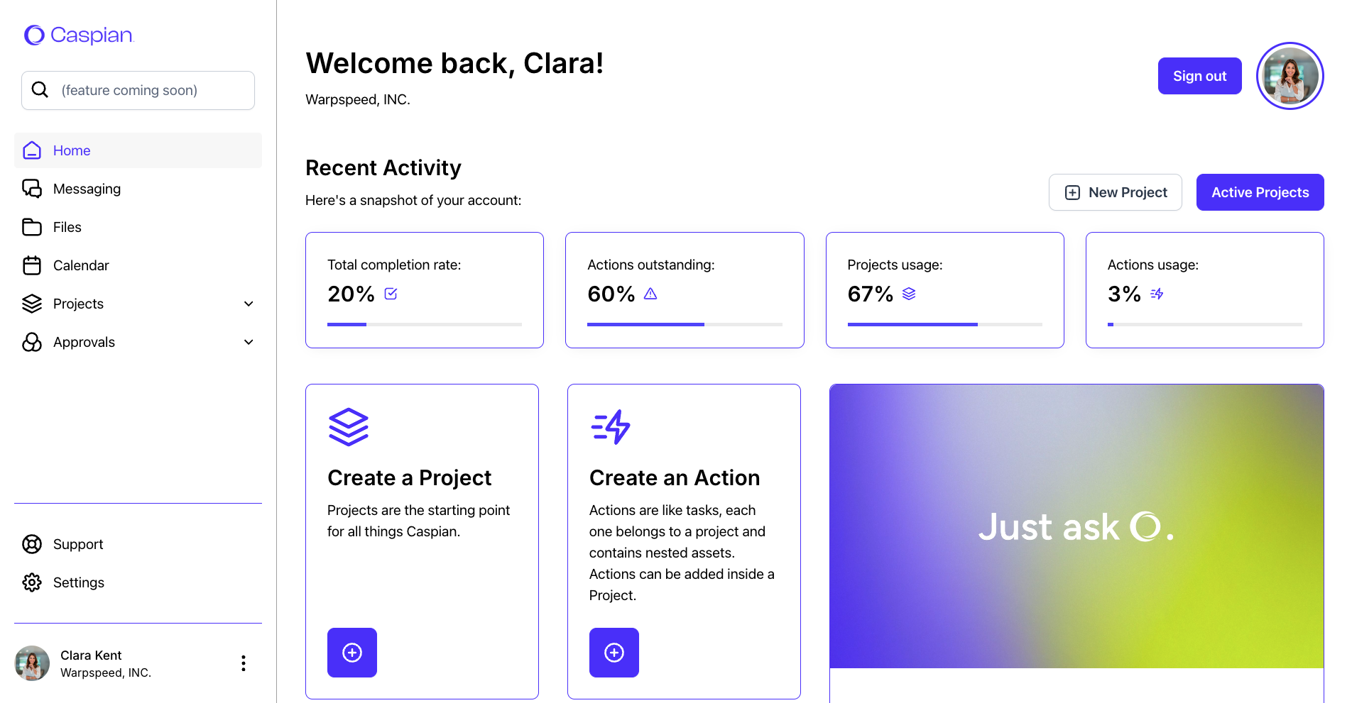 Our platform structure follows proven organizational methods for setting and achieving goals. Start with a Project, add task steps called "Actions," and add assets to dedicated approval flows for review.