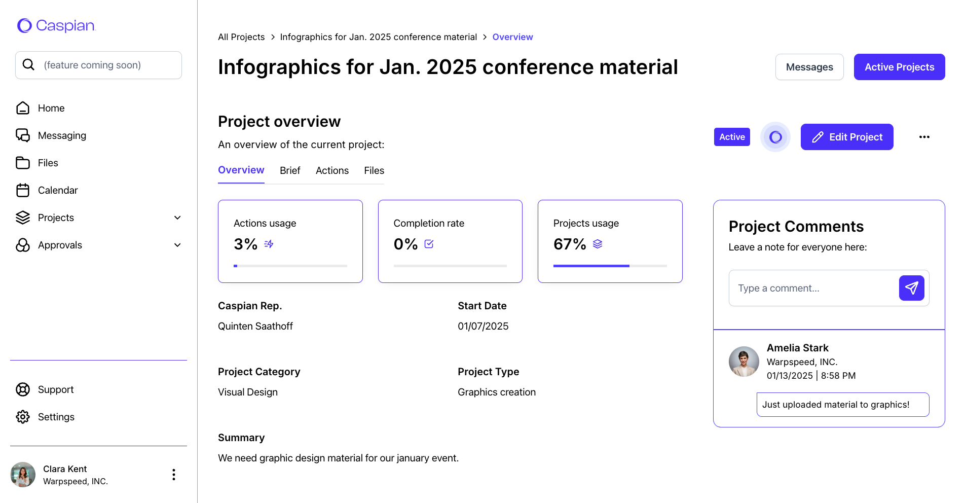Our fulfillment based retainers are designed for companies that want to offload their creative workflows to our team. You can upgrade to one of these plans on an as-needed basis or downgrade to the free or another available platform access plan at any time. These plans offer access to the Ask Caspian button, and allow your team to send us project management requests with a single click.