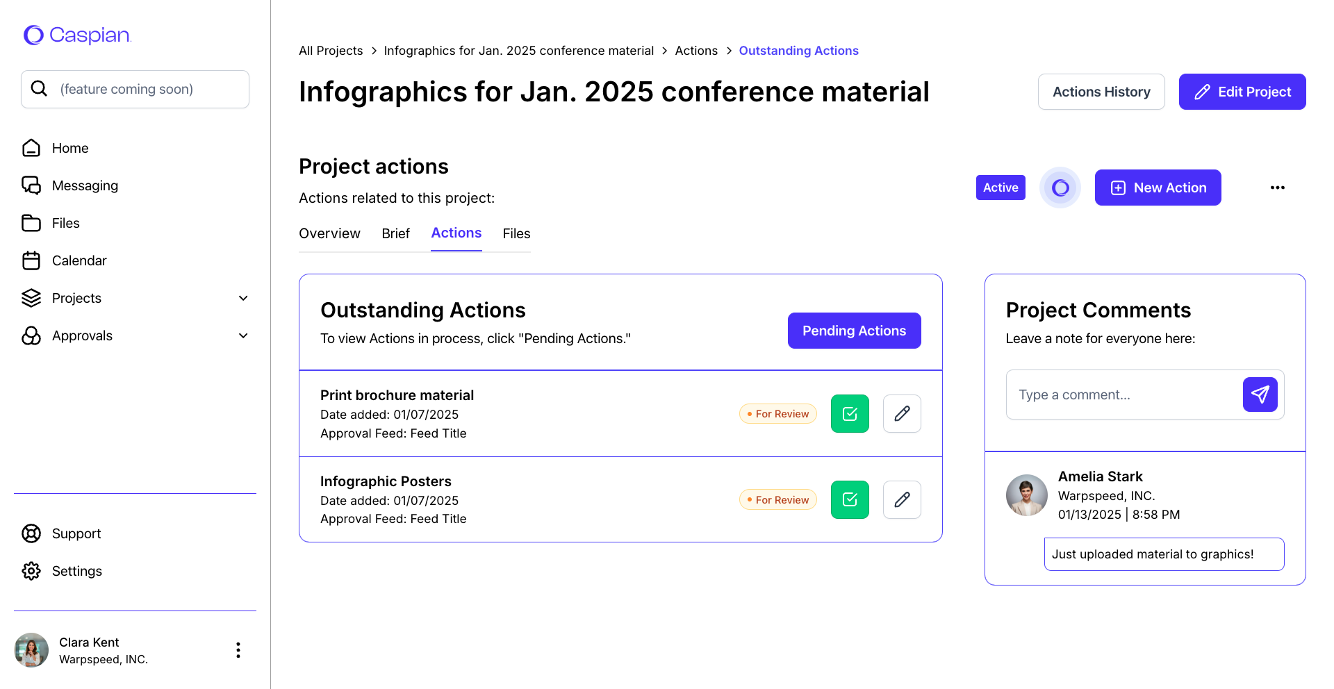 Our platform structure follows proven organizational methods for setting and achieving goals. Start with a Project, add task steps called "Actions," and add assets to dedicated approval flows for review.